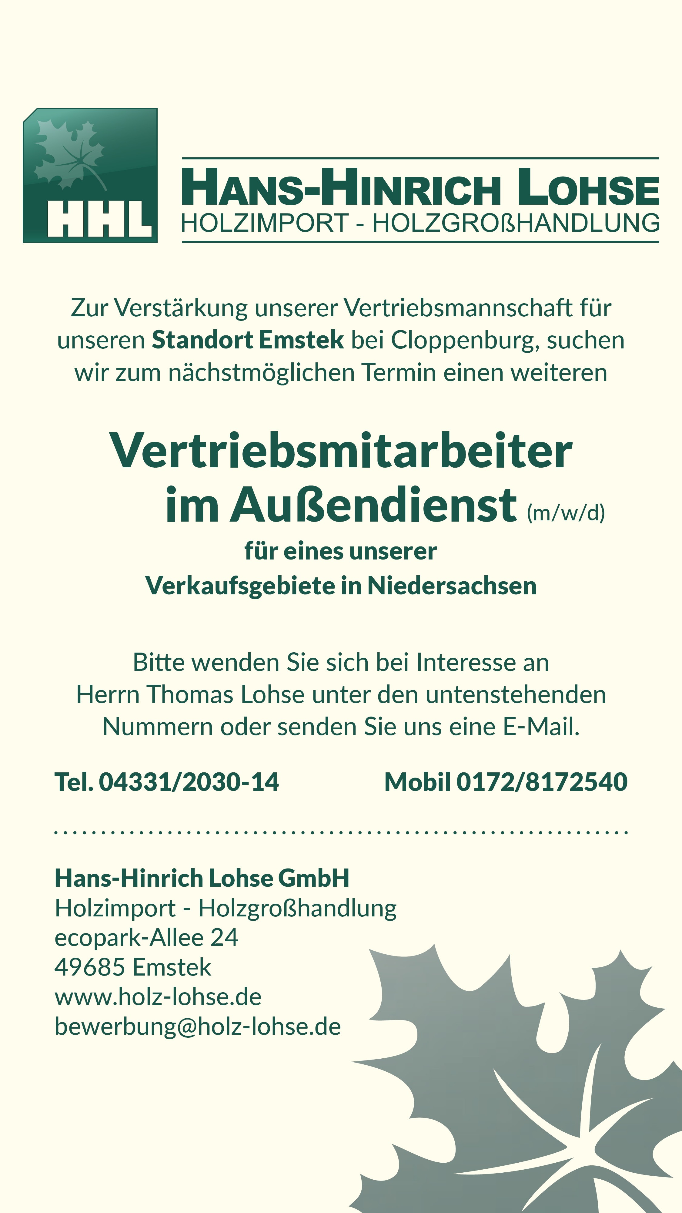 Hans-Hinrich Lohse GmbH: Vertriebsmitarbeiter im Außendienst (w/m/d)